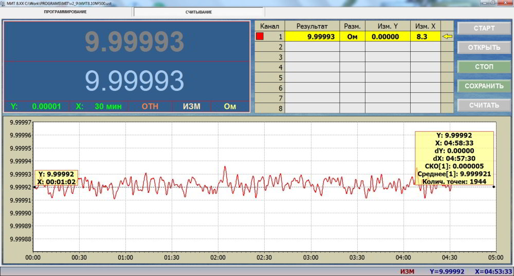 Управляющая программа состоит из двух страниц: «Программирование» и «Считывание». Страница «Программирование» позволяет настраивать МИТ 8 (вводить статические характеристики преобразования ТС и ТП, задавать токи питания ТС и режимы компенсации холодного спая ТП, калибровать встроенные опоры и т. д.), а также управлять работой прибора при помощи ПК. Страница «Считывание» позволяет считывать из МИТ 8 результаты измерений, отображать их в виде графиков и сохранять на ПК.